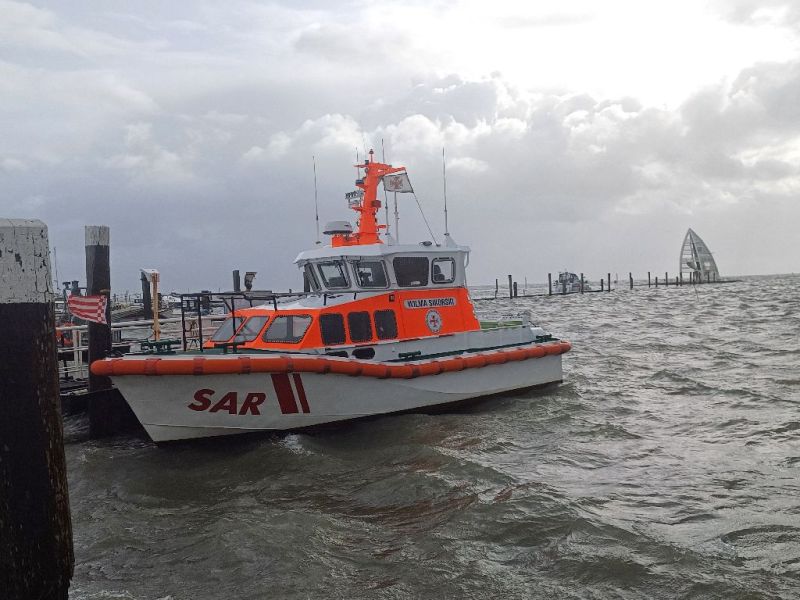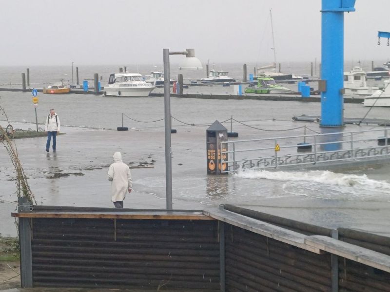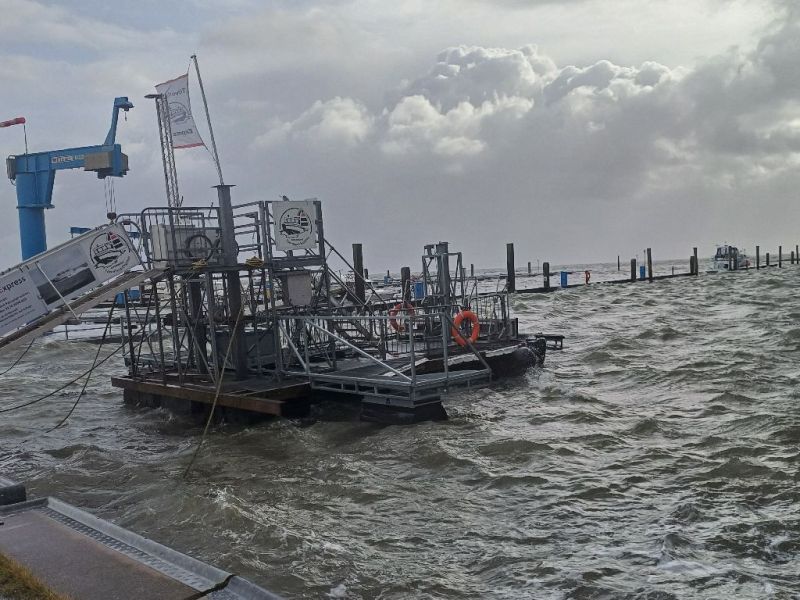 Über die Schräge der Küstenschützer liefen die Wellen zur Hochwasserzeit bis zu den Fahrrädern, die dort abgestellt waren. Auch leidet bei den hohen Wasserständen der Zugangssteg zur Schwimmsteganlage vom Segelklub Juist. Man hofft, dass die Scharniere alles schadlos überstanden haben. Einige Bootseigner haben ihre Boote vorher auf die Nordseite des Steges verlegt, der von West nach Ost im Bootshafen liegt, da lagen die Schiffe sehr ruhig und geschützt.