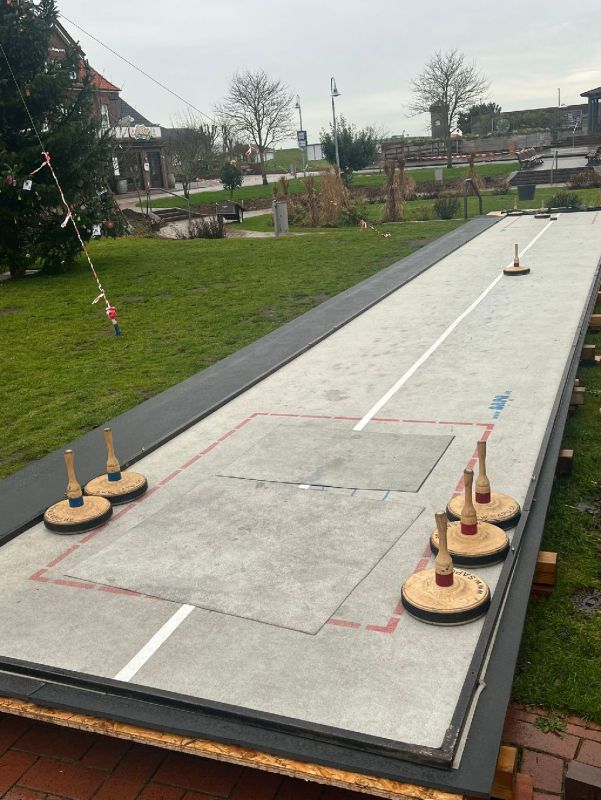 Die Stöcke, die auf die Bahn geworfen werden, müssen möglichst nah an das Ziel gleiten. Zwar ist auf Juist nur selten mit Eis und Schnee zu rechnen, doch gibt es mittlerweile andere Möglichkeiten, die ein Stockschießen auch ohne Energieaufwand auf Kunststoffbahnen erlauben.