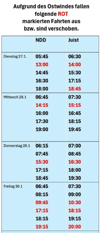 Die Reederei Töwereland-Express teilt mit: Durch die anhaltende Ostwindlage und dem damit verbundenen niedrigen Wasserständen sowie dem langsameren Auflaufens des Wassers kommt es in den nächsten Tagen immer wieder zu Ausfällen von Fahrten. Sie ersehen diese auf dem hier eingefügten Fahrplan.