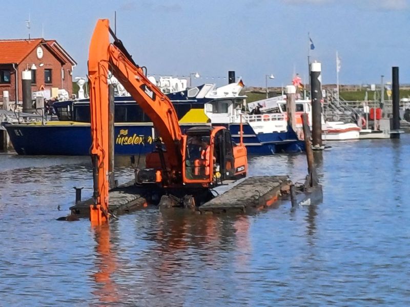 Baggerarbeiten stehen jetzt auch im Bootshafen der Inselgemeinde an, welcher von der Kommune an den Segelklub Juist (SKJ) langfristig verpachtet ist. In jedem Jahr müssen Baggerarbeiten durchgeführt werden, damit er für Boote nutzbar ist, diese stehen jetzt an. Dazu wird das Baggerschiff „Utlandshörn“ vom NLWKN eingesetzt, welches mit seinem Injektionsspülsystem sehr effektiv arbeitet. Von den Mitgliedern des SKJ wurde dazu bereits die Fingerstege entfernt, ebenso wurde der sogenannte A-Steg direkt an der Schwallschutzwand ausgeschwemmt und gen Osten verbracht, damit die Baggerung in dem Bereich beginnen kann. Wie der Homepage vom SKJ zu entnehmen ist, soll der Bootshafen ab dem 24. April 2026 geöffnet sein. Bis dahin sollten Gastlieger den Juister Hafen nicht anlaufen, da keinerlei Liegeplätze zur Verfügung stehen.
