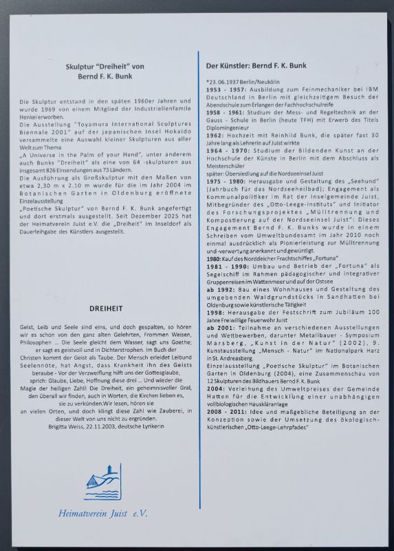 Etwas weiter gen Westen fand eine kleine Baumaßnahme auf der Rasenfläche an der Ecke Wilhelmstraße/Damenpfad statt. Hier wurde im vergangenen Winter bereits eine Skulptur des ehemaligen Juister Künstlers Bernd F. K. Bunk aufgestellt (JNN berichtete), in der vergangenen Woche wurde durch Hansgeorg Peters vom Heimatverein Juist ein entsprechendes Infoschild zu dem Kunstwerk aufgestellt. Hier erfährt man alles Wissenswerte über das Kunstwerk und seinem Erbauer.