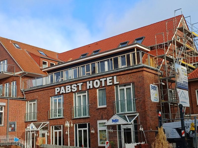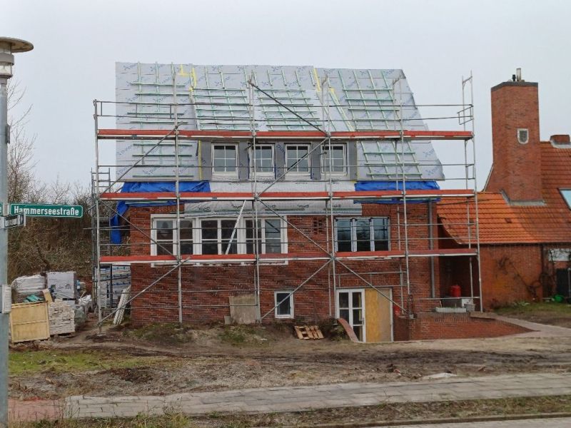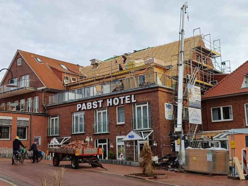 Weithin sichtbar die Arbeiten am Hotel „Pabst“ in der Strandstraße, wo das Dach am südlichen Teil des Gebäudes erneuert wurde. Tätig war hier vor allem mit der Firma „Juist Dach“ ein Juister Unternehmer (ehemals Baugeschäft Gebr. Rehfeldt). Das Foto oben auf der Startseite entstand Mitte November, auf dem zweiten Foto ist der Baufortschritt gut zu erkennen, es entstand kurz vor Weihnachten.