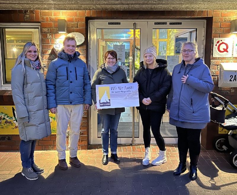 Das Foto zeigt (v.l.n.r.) Janina Hagenow, Gerrit Schlauwitz (Schulleiter der Inselschule), Frauke Rose (Vorstand der Juist-Stiftung), Melanie Boomgaarden (Leiterin der Kita Schwalbennest) und Carina Janssen-Visser (Förderkreis der Inselschule Juist).