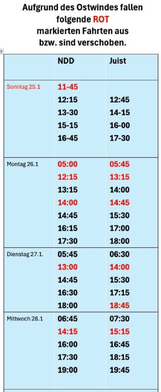 Die Juister Reederei Töwerland-Express hat einen geänderten Fahrplan für die nächsten Tage erstellt. Sollte der Juister Hafen allerdings vereisen, müssen die Fahrten eingestellt werden.