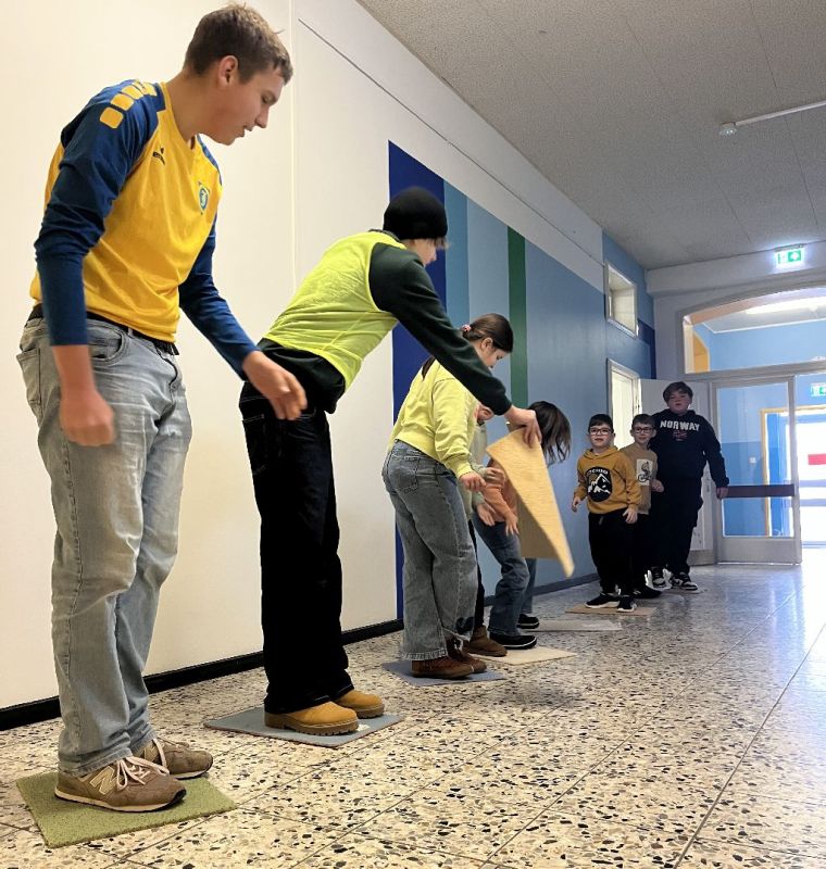 Begonnen wurde mit einem gemeinsamen Frühstück an einer langen Tafel auf dem Flur der Oberschule. Gut gestärkt starteten die 55 Schüler, die ihre Kleiderwahl passend zu ihrer Gruppenfarbe trafen, anschließend mit dem Aktivprogramm. Die Schülervertreter überlegten sich sechs Stationen, an denen alle Schüler der Klassen 1-10 in altersgemischten Gruppe gegeneinander antraten. Vorrangig ging es darum, im Team zusammenzuarbeiten, zu kommunizieren und natürlich viel Spaß zu haben.