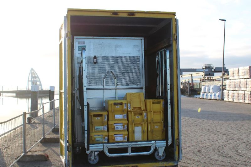 Die Post gehört somit zu den übrigen Frachten und ist also erst mit etwas Verzögerung an der Reihe. Mittels Gabelstapler werden die Rollis aus dem Janssen-Hänger geholt und in die Postanhänger umgeladen. Dabei ist vorsichtiges Handeln vonnöten, die die heutigen Anhänger sind sehr viel höher und können bei unsachgemäßer Handhabung (z.B. zu starkes Einschlagen der Deichsel/Vorderräder) leicht kippen. Aber die Mitarbeiter Tomek Meger und Waldek Zieminski machen das inzwischen mit großer Routine. Nach Beladung der Postwagen erhalten die Postmitarbeiter eine Whatsapp-Nachricht, dass die Wagen abholbereit sind. Die Umladung am Hafen passiert bei jedem Wetter, ergänzt Solveig Schmitz von der Hafenlogistik. Bei Regen nicht immer optimal, denn die Rollis mit der Paketpost sind nach vorne und oben offen.