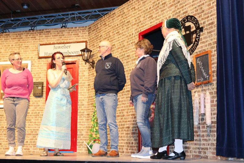 Die letzten Bilder entstanden am Ende der Aufführung, der Feuerwehr, vertreten durch Musikzugführerin Britta Bockelmann und die Trachtengruppe mit ihrer Leiterin Anja Büsing-Bartels erhalten als Dank ein kleines Geschenk durch die Heimatvereinsvorsitzende Sylvia Hupens. Ein weiteres Bild zeigt alle Akteure, das letzte Foto wurde aufgenommen, als Autorin Anita Pastoor sich für die Aufführung bedankte, denn sie hatte noch ein Stück von sich in hochdeutscher Sprache erlebt.
