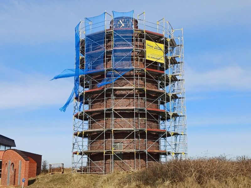 „Wir mussten daher die Ausschreibung einmal neu starten und in die einzelnen Gewerke aufteilen,“ so Carina Janssen-Visser von der Abteilung Bauunterhaltung der Gemeinde. Das wurde dann gemacht und am 27. Januar im Rat wurden dann die einzelnen Gewerke bestätigt und die Aufträge entsprechend der Vergaberichtlinien erteilt. Allerdings sah die Rechnung nun anders aus: Die Firma Tell gab nun ein Angebot über ca. 155.500 Euro für die sogenannten Bauhauptarbeiten ab. Dazu gesellten sich jetzt aber vier weitere Betriebe, die die Zuschläge für Gerüstbauarbeiten, Dacharbeiten und Bauklempnerei, Stahlbauarbeiten sowie Lieferung und Einbau neuer Fenster und Türen bekamen, so dass sich die Gesamtsumme aller Arbeiten unterm Strich auf rund 233.800 Euro beläuft. Jetzt konnte mit der Sanierung begonnen werden und der Wasserturm bekommt pünktlich zu seinem 100. Geburtstag ein schönes Make-Over.