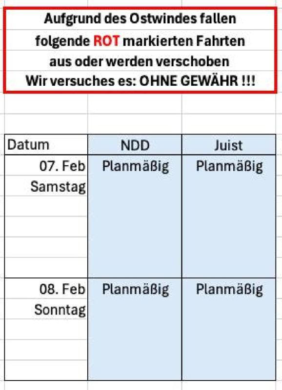 Die Juister Reederei Töwerland-Express teilt mit, dass es im Hafen jetzt wieder besser aussieht und man beabsichtigt, ab Samstag, den 07. Februar 2026, wieder nach Plan zu fahren.
