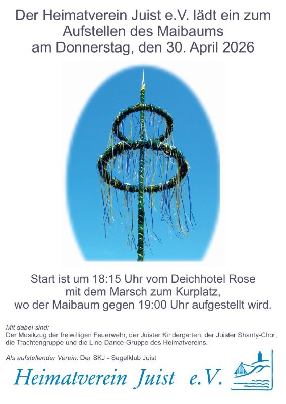 Am Donnerstag, den 30. April 2026, findet wieder das alljährliche Aufstellen des Maibaumes statt. Weitere Infos, Uhrzeit usw. finden Sie auf dem beigefügten Plakat.
