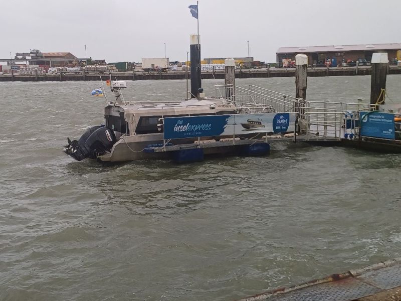 Die "Töwi II", die von Reeder Schmidt selbst gefahren wird und daher auf Juist liegt, konnte einen Liegeplatz am Anleger der Reederei Norden-Frisia benutzen, weil das Schiff dort geschützter und ruhiger lag als am Anleger der Töwis.