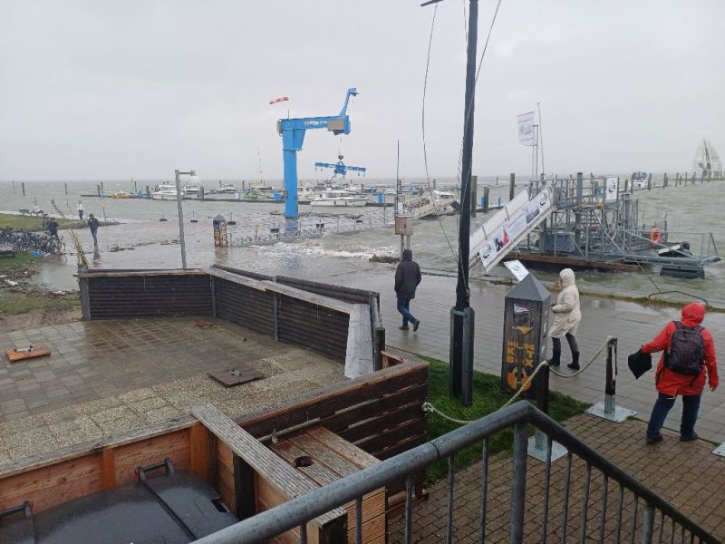 Über die Schräge der Küstenschützer liefen die Wellen zur Hochwasserzeit bis zu den Fahrrädern, die dort abgestellt waren. Auch leidet bei den hohen Wasserständen der Zugangssteg zur Schwimmsteganlage vom Segelklub Juist. Man hofft, dass die Scharniere alles schadlos überstanden haben. Einige Bootseigner haben ihre Boote vorher auf die Nordseite des Steges verlegt, der von West nach Ost im Bootshafen liegt, da lagen die Schiffe sehr ruhig und geschützt.
