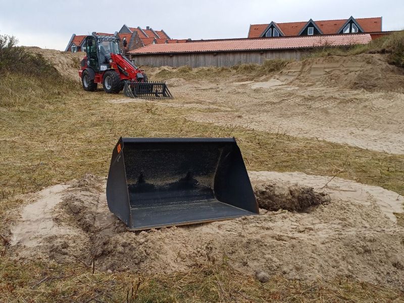 Weiter geht es in Richtung Dünenfriedhof. Die Fotos 6 und 7 entstanden auf dem Gelände zwischen OT-Lager und Friedhofsweg (östlich vom Inselhospiz). Die Arbeiten werden durch die Hafenlogistik der Wohnungsbaugenossenschaft Juist – Infrastruktur und Wohnen eG durchgeführt. Mit Satzungsbeschluss durch den Gemeinderat aus Ende Januar können bereits Bauanträge zum Plangebiet gestellt werden. „Aktuell finden nach Rücksprache mit der Domänenverwaltung des Landes Niedersachsen und der Inselgemeinde genehmigungsfreie Erdarbeiten statt“, so Gerhard Jacobs, Vorstandsvorsitzender der Genossenschaft, im Gespräch mit JNN. Invasive Pflanzenarten werden dabei großflächig entfernt sowie kleinere Bäume und Sträucher für ein späteres Umpflanzen auf dem Areal gesichert. Derzeit werden ausschließlich vorgenannte Arbeiten durchgeführt, so Jacobs weiter, denn das eigentliche Bauprojekt befinde sich noch in frühen Planungsschritten.