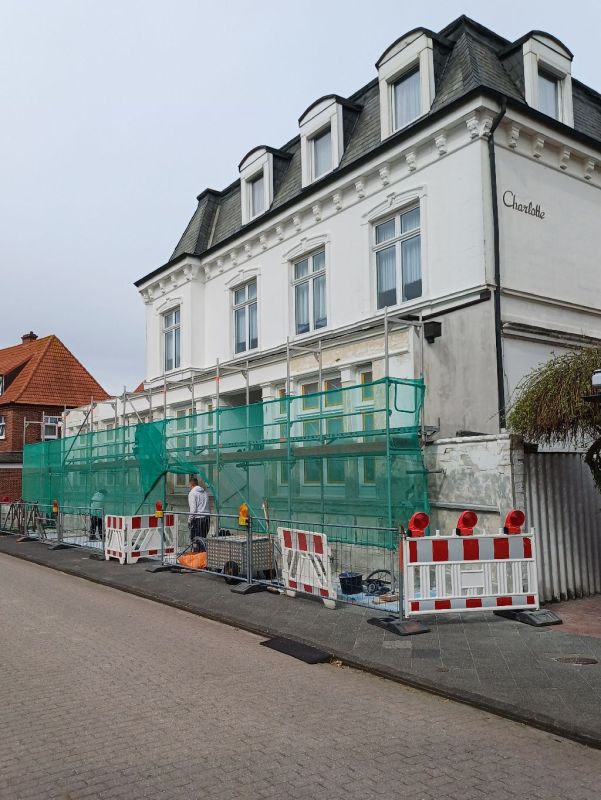 Zurück ins Dorf, wo in der Wilhelmstraße/Ecke Friesenstraße die Villa „Charlotte“ durch ein Juister Baugeschäft eine Fassadensanierung erhält. Das Haus wurde wenige Jahre vor der Jahrhundertwende (1900) von Heinrich Schröder erbaut. (Quelle: „Grüße aus Juist“ von Reinhold W. Feldmann, Burchana Verlag Borkum, 1981). Heute wird das Haus als Frühstückspension von der Juisterin Inka Extra geführt.